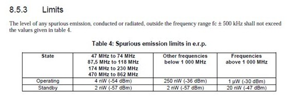 雜散發(fā)射的測試需要測試工作模式與待機(jī)模式,其限值有所不同,如下標(biāo)所示: